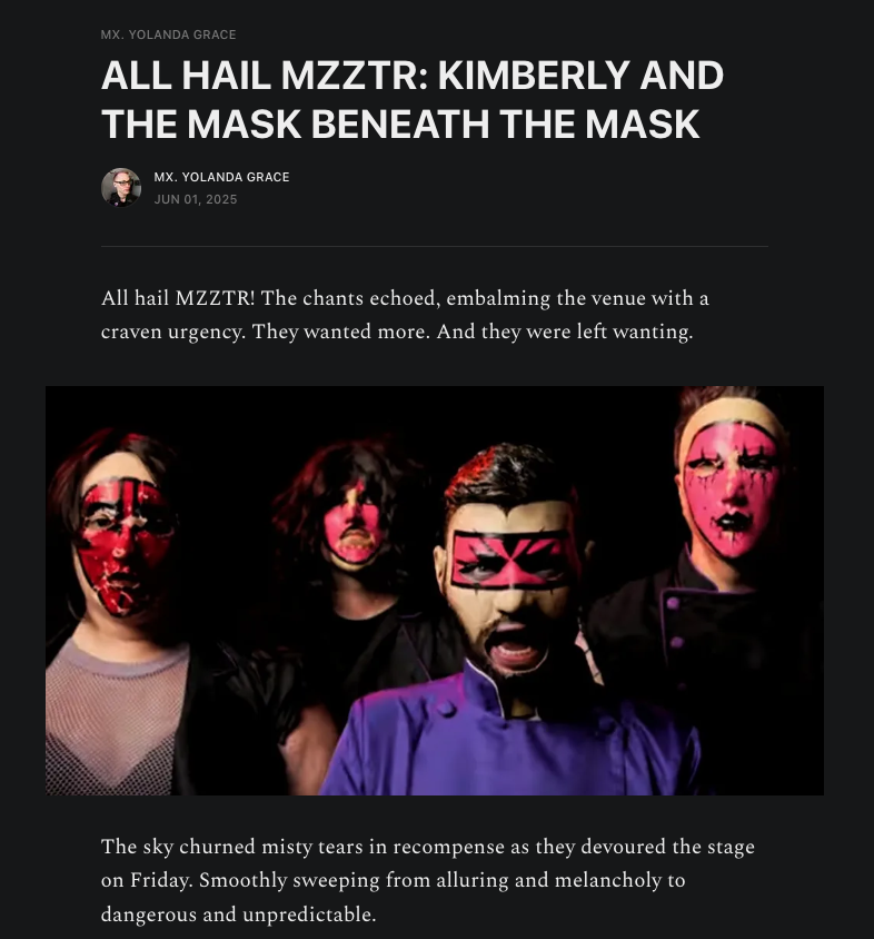 “Kimberly by MZZTR is a face-peeling, flesh-seducing anthem for the age of toxic beauty, where glam meets gore and influencers become goddesses of rot. Part Clive Barker fever dream, part operatic takedown of vanity culture, it’s a stunning debut from a band you won’t forget—or escape.
